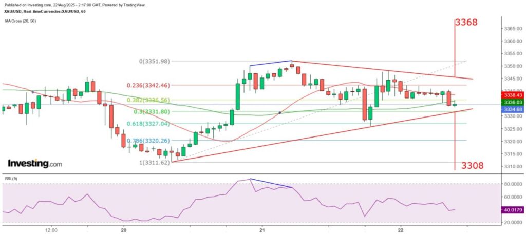 數據公佈後,金價在紐約時段於 3340 美元 附近窄幅徘徊,小時圖上多次收於該水平以下,顯示投資者正在等待新催化劑——今晚美聯儲主席鮑威爾的講話。